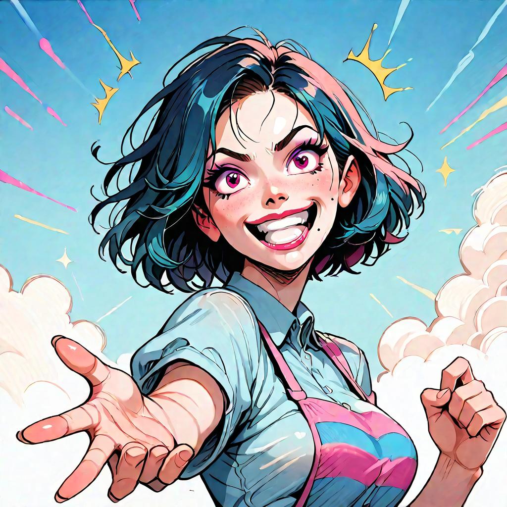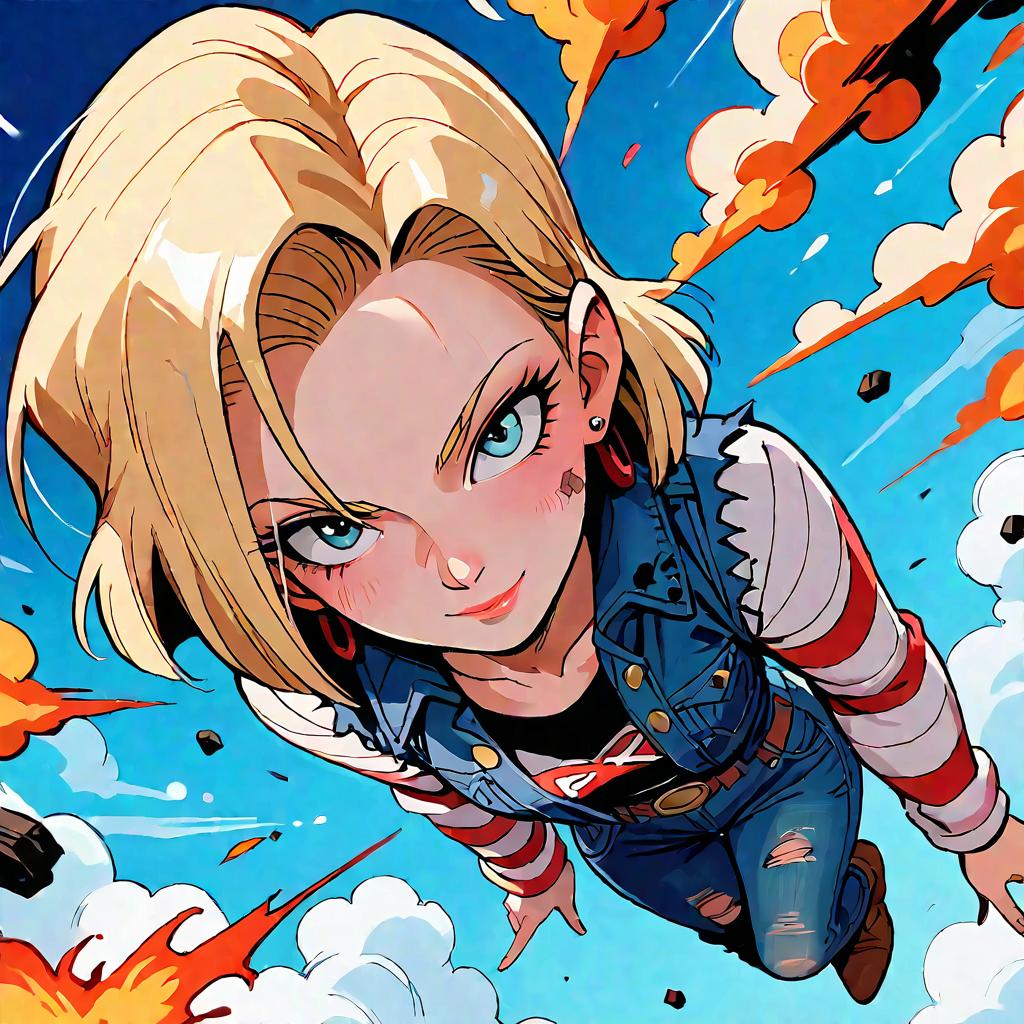 Source_anime, score_9, score_8_up, score_7_up, anime screencap, android 18, 1girl, solo, looking at viewer, smile, short hair, blue eyes, blonde hair, shirt, long sleeves, dodging, hoop earrings, boots, torn pantyhose, torn clothes, from above, brown footwear, forehead, fire, looking up, denim, smoke, explosion, classic look, jumping, retro artstyle, striped sleeves, midair, expressionless, collarbone, cloud, day, dirty face, dirty clothes, anime coloring