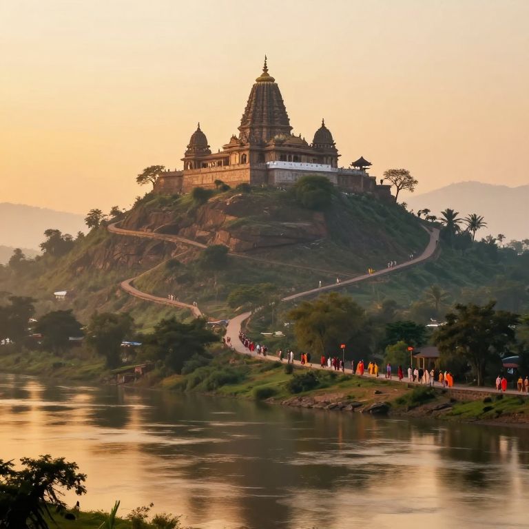 Photograph of a majestic Hindu temple complex at sunset, perched on a lush, green hill by a reflective river. The temple features intricate, multi-tiered spires and is surrounded by winding pathways. Silhouetted against a golden-orange sky, the temple and hill are reflected in the calm water below. In the foreground, a group of people dressed in bright red and orange clothing walk along the path, adding a vibrant contrast to the natural and architectural elements. The background includes hazy, distant mountains and scattered trees, enhancing the serene and picturesque scene.