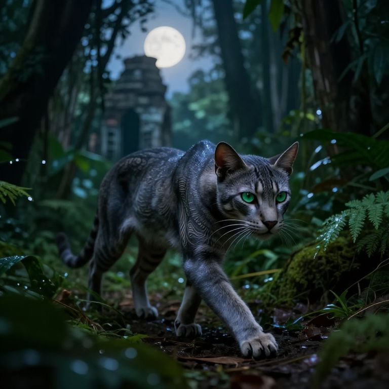 Digital artwork of a gray tabby cat with striking green eyes, walking through a dark, enchanted forest under a bright full moon. The cat's fur is detailed with subtle stripes and a slightly wet texture. Surrounding the cat are lush, green ferns and moss-covered ground, with a slightly blurred, ancient stone structure in the background. The moonlight casts a cool, blue glow over the scene, creating a mystical atmosphere. The cat's focused expression and graceful movement add a sense of mystery and adventure to the image.
