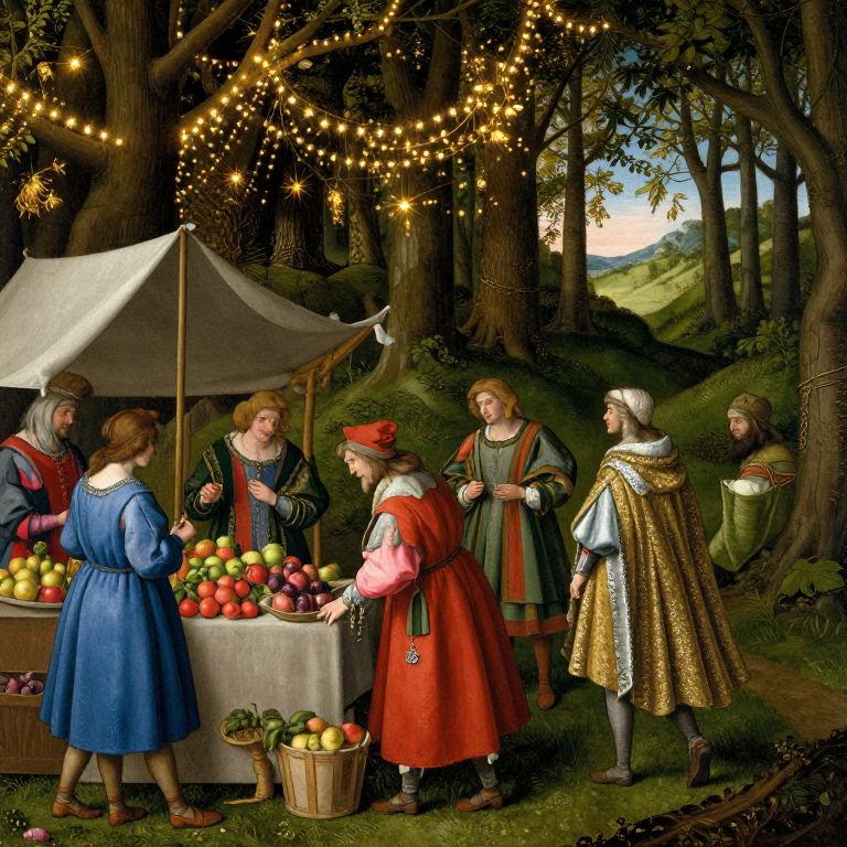 Visualize an energetic medieval marketplace, captured in the vivid manner of Flemish artistry with intricate details akin to Bruegel's works. From a unique viewpoint, witness the captivating interplay of colors and textures as vendors exhibit their goods - from radiant fruits to gleaming fabrics. This scene gracefully shifts into a mystical woodland, where enchanting fairy lights drape over ancient trees, creating shadows that dance merrily with the light. A solitary traveler in Renaissance-inspired attire, draped in a cloak woven with threads of gold and silver, crosses this magical boundary, their gaze fixed on the distant horizon as they contemplate the enigmas of the world beyond.