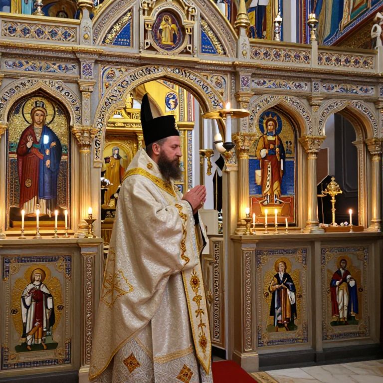 Orthodox priest in traditional vestments performing a ritual in an ornate church, surrounded by intricate mosaics, glowing candles, and ancient religious artifacts, vivid colors with a solemn and spiritual mood.
