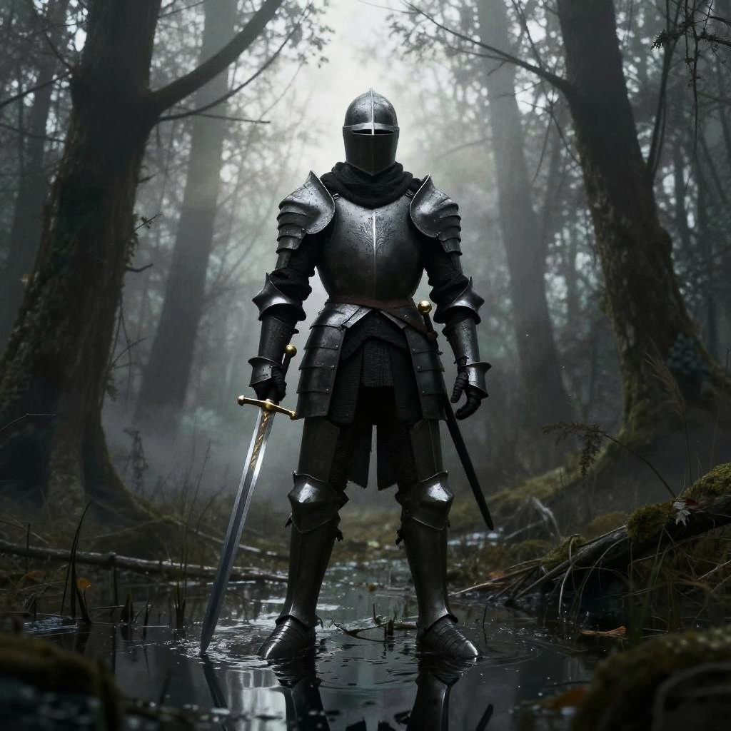 Photorealistic CGI of a knight in shiny silver armor, holding a lightning bolt, standing in a ruined, moss-covered castle under a stormy sky