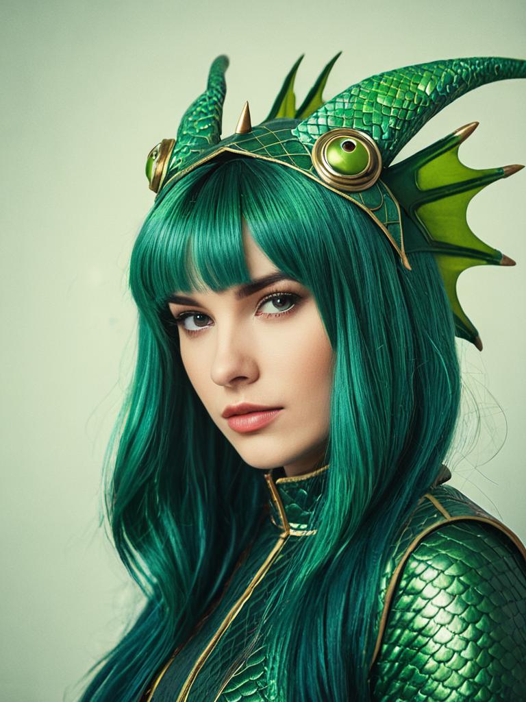 Green Fish, a close up of a woman with green hair and a green dragon costume --sref 1387