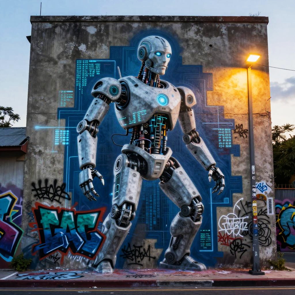 Graffiti AI generator producing large-scale murals featuring robotic humanoids and digital code streams, mixing classic graffiti styles with modern AI visuals, set on aged concrete surfaces under soft street lamp glow.