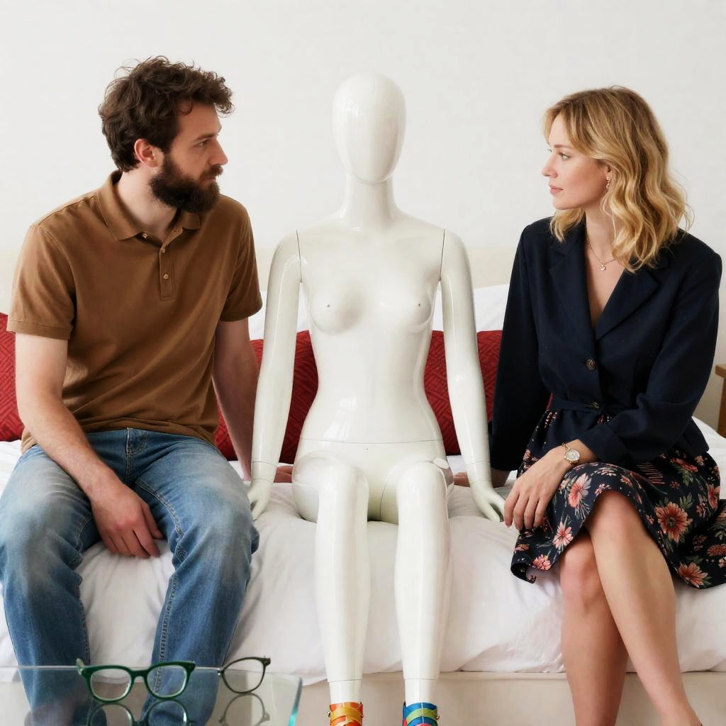 Photograph of three people on a white bed. A white, female, mannequin with exposed breasts and painted green eyes sits between a bearded man in a brown shirt and blue jeans, and a blonde woman in a navy jacket and floral skirt. The mannequin wears white pants and colorful shoes. Two green glasses on a glass table in the foreground. The woman looks down, the man looks at the mannequin. Red patterned pillows in the background.