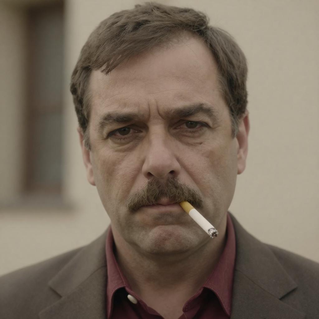 Close-up photograph of a middle-aged man with a serious expression, brown hair, slight mustache, and a cigarette in his mouth. He wears a brown suit over a red shirt. The background is blurred with warm tones. His forehead is slightly wrinkled. The man is centered in the frame.