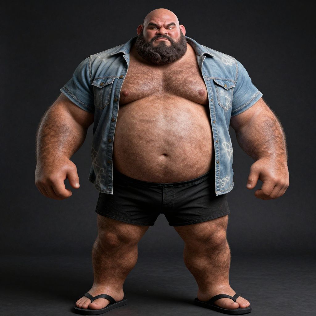 Big burly beefy strongman, epic, gritty, dark, stylized, masculinity, hairy, dad energy, summer vibes, shorts, shirt, flip flops, love, wholesome, photography, high detail, high resolution