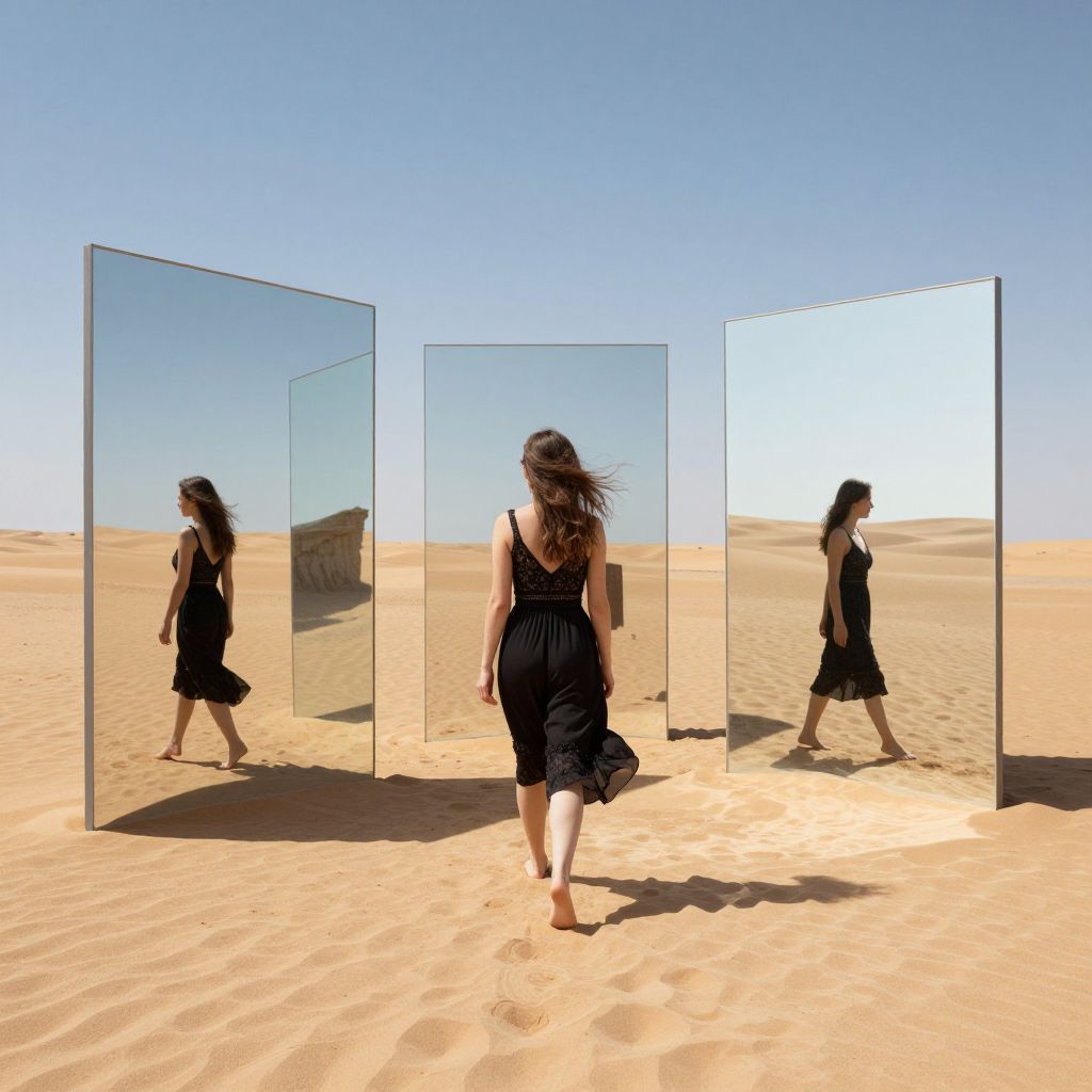 Woman walking barefoot through a surreal desert landscape, surrounded by three large reflective mirrors that distort reality, revealing her mirrored reflections as if they are escaping into another dimension under the bright sun.