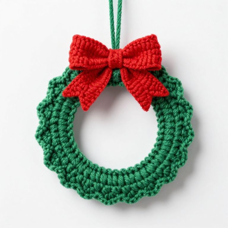 Handcrafted green crocheted Christmas wreath ornament featuring a vibrant red bow centered atop, suspended by a matching green string against a plain white background.