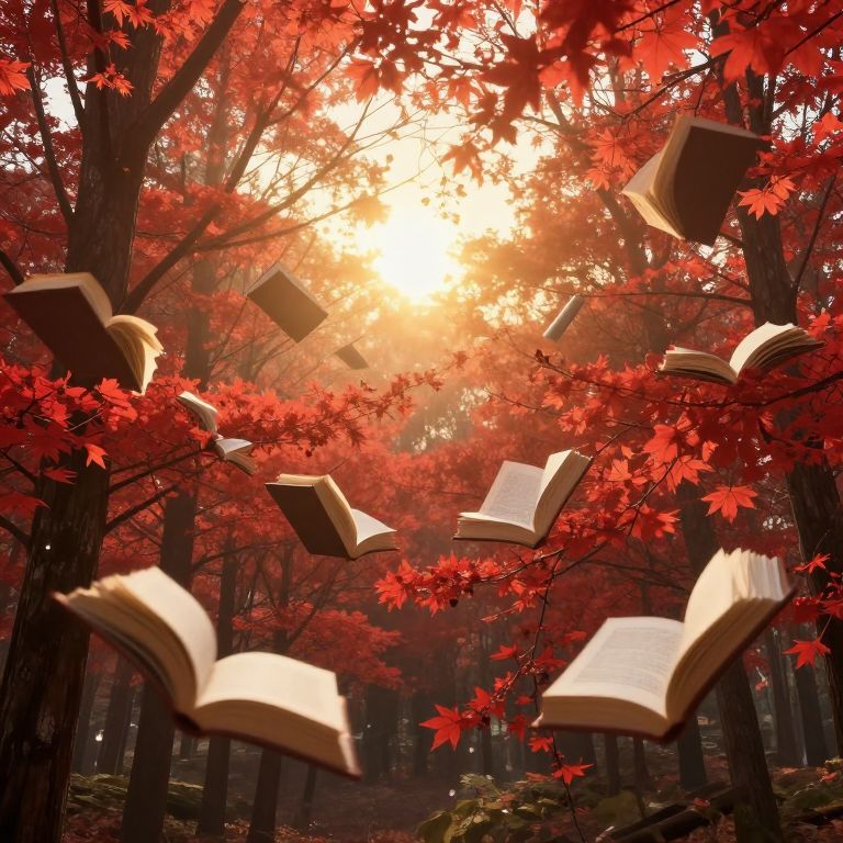 Photograph of open books floating among vibrant red autumn leaves in a sunlit forest, creating a magical, whimsical effect.