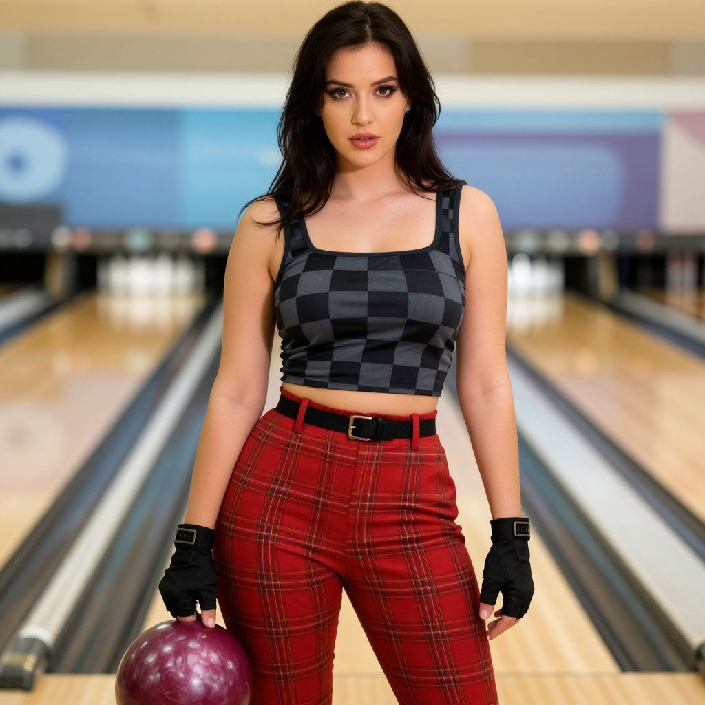 "Woman, retro-inspired, cropped tank top with black and gray checkered pattern, square neckline, thin straps, high-waisted trousers in red plaid with subtle yellow and blue stripes, fitted silhouette, black belt with a simple buckle, fingerless black gloves, holding a bowling ball, bowling alley background.. Sexy. Pretty face and beаutiful eyes. Big breasts."