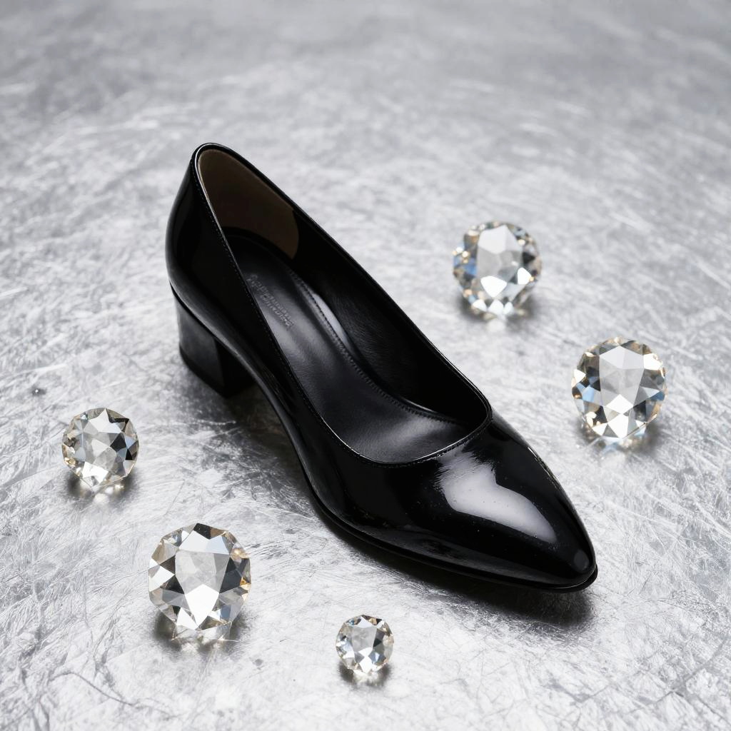 This is a high-contrast, artistic photograph featuring a single black leather shoe floating against a textured, light gray background. Surrounding the shoe are six large, clear ice cubes, each reflecting light and casting subtle shadows. The shoe is centrally positioned, with ice cubes arranged asymmetrically around it, creating a visually striking composition. The photo has a dramatic, almost surreal quality.