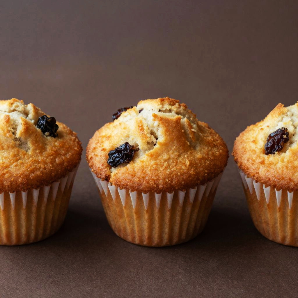 This is a close-up photo of three golden-brown muffins with a slightly domed top and a few visible raisins. They're lined up in a row on a dark brown, textured surface. The muffins have a light, slightly crunchy texture with a soft, fluffy center. The lighting highlights their warm, inviting color and makes them look freshly baked.