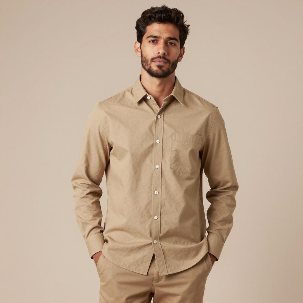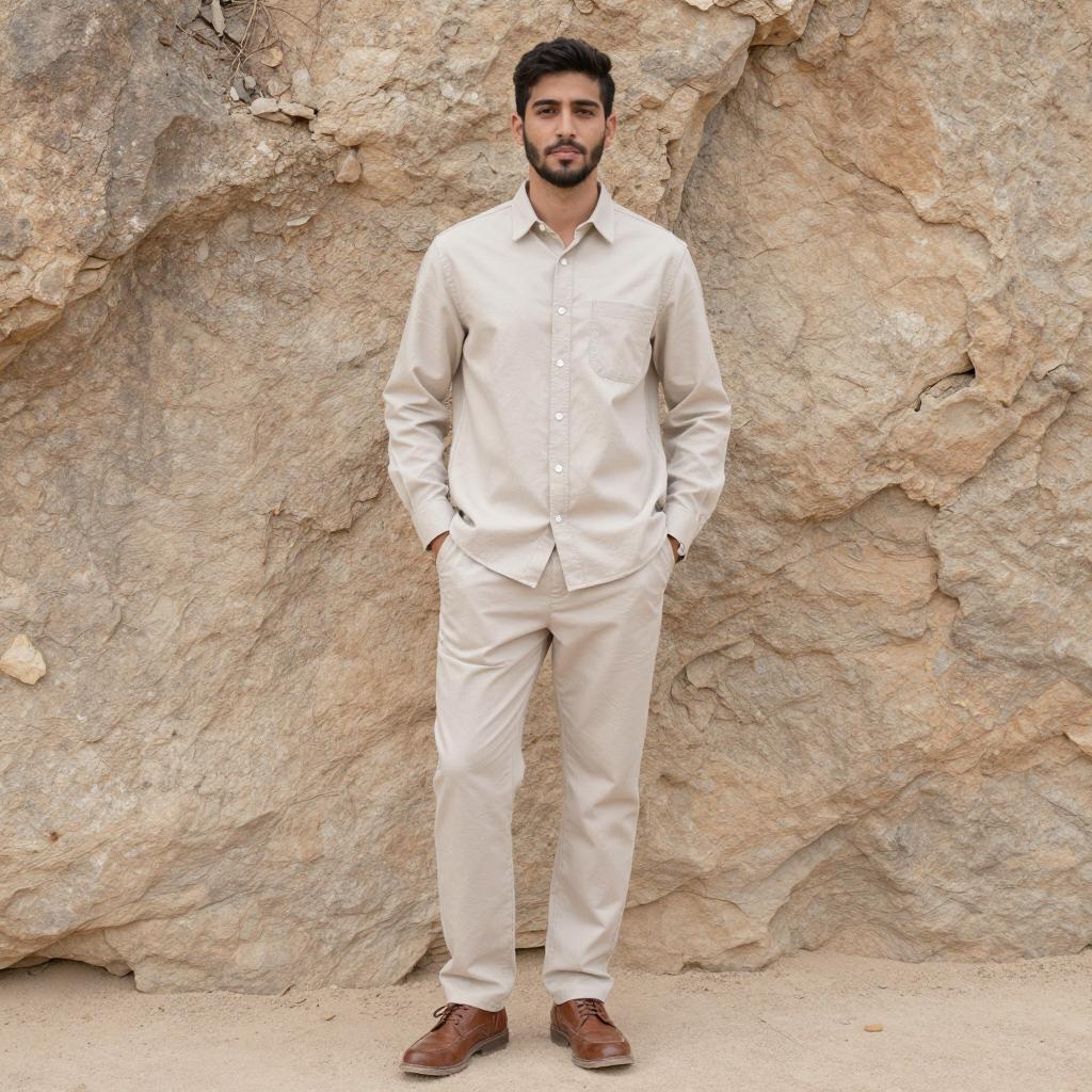 Young man with light brown skin and trimmed beard standing outdoors in front of a large beige rock wall. He is wearing a coordinated light beige long-sleeve button-up shirt with matching cotton trousers and brown leather shoes. The setting is a daytime desert-like environment, with natural light and minimal shadows. The man has short black hair, a neutral expression, hands in pockets, and a relaxed posture.