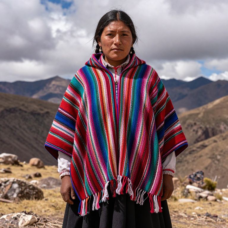 A person wearing a traditional Andean poncho made from aguayo fabric, standing in a mountainous landscape, vibrant patterns on the fabric contrasted against earthy tones of the environment, dramatic cloudy sky, rich colors, cultural authenticity, photo realistic style.
