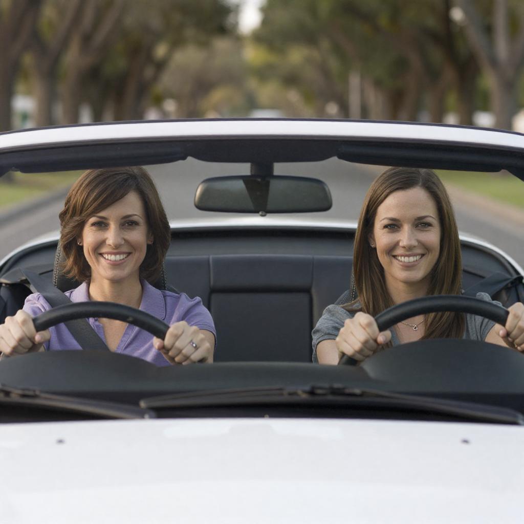 Photograph of two women driving a white convertible, both smiling. Woman on left has short brown hair, wearing purple shirt. Woman on right has long brown hair, wearing gray shirt. Both hands on steering wheel. Tree-lined street in background. Sunlight.