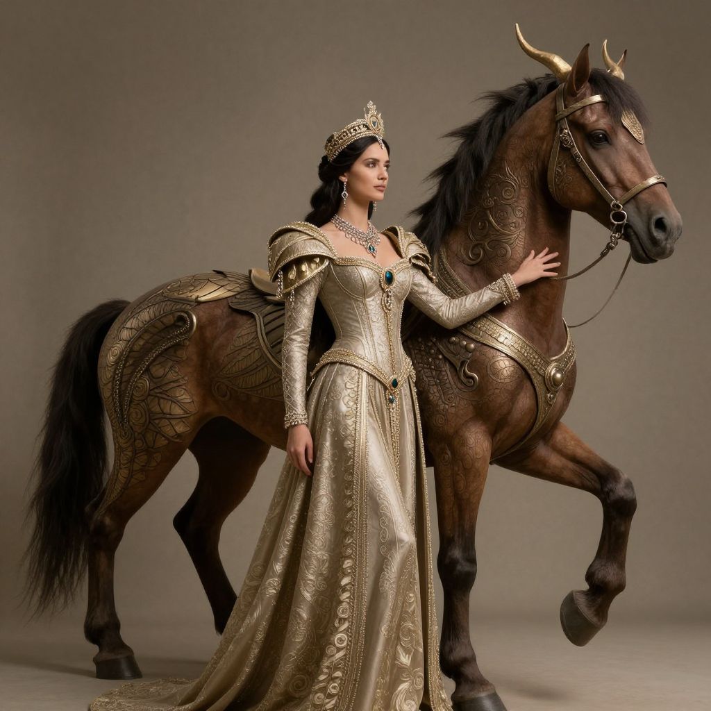 A regal woman adorned in ornate jewelry stands serenely beside a horse whose body seamlessly transforms into a mythical dragon, defying the boundaries of reality in a surreal fusion of human, equine, and fantastical forms.