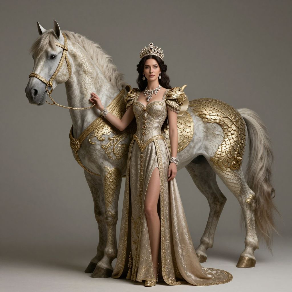 Photograph of a regal woman with dark, wavy hair wearing a sparkling gold crown and an elaborate, gold-embroidered gown with a high slit. She stands confidently beside a white horse adorned with matching gold, scale-like armor. The horse has a white mane and tail, and a gold bridle. The woman's gown has shoulder pads and intricate patterns, and she wears a statement bracelet and necklace. Both the woman and horse are set against a plain, gray gradient background, emphasizing their opulent, fairy-tale-like appearance. The image exudes a medieval, fantasy aesthetic.