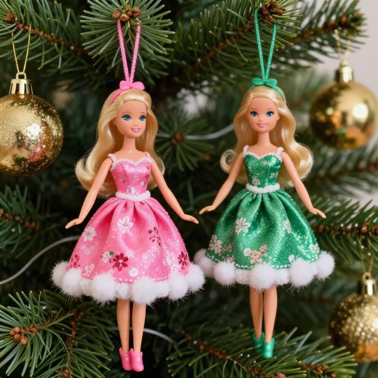 Two Barbie-themed Christmas tree ornaments, one in a vibrant pink dress with floral patterns and fluffy white pom-poms at the hem, and the other in a shimmering green dress with similar details, hang gracefully among lush green pine branches and golden baubles, creating a festive holiday display.