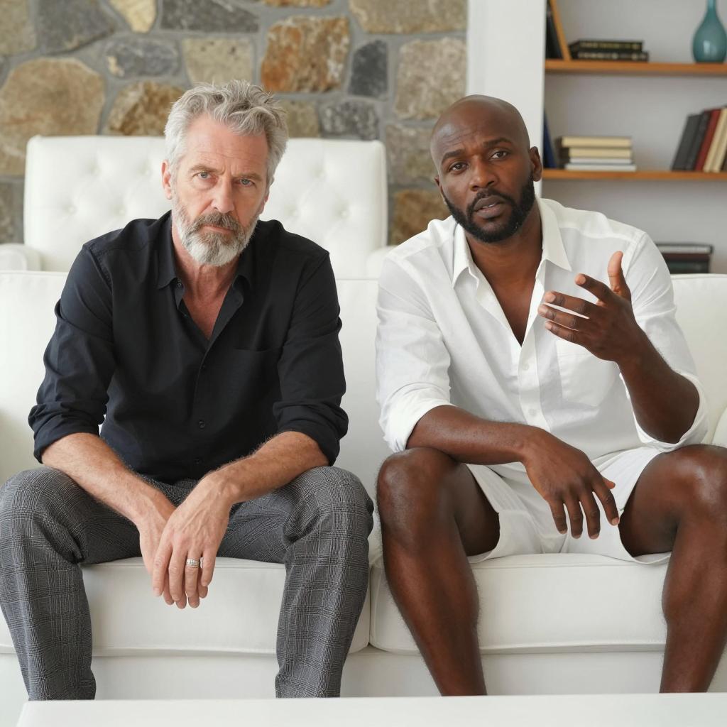 Two men standing outdoors against a clear blue sky. The man on the left has short brown hair, a white shirt with black patterns, and smiles slightly. The man on the right has a bald head, glasses, a black tank top, a gold chain, and a beard. He looks upward with a serious expression. Both men are in profile, with the man on the right's arms crossed. The man on the right's skin is darker than the man on the left's.