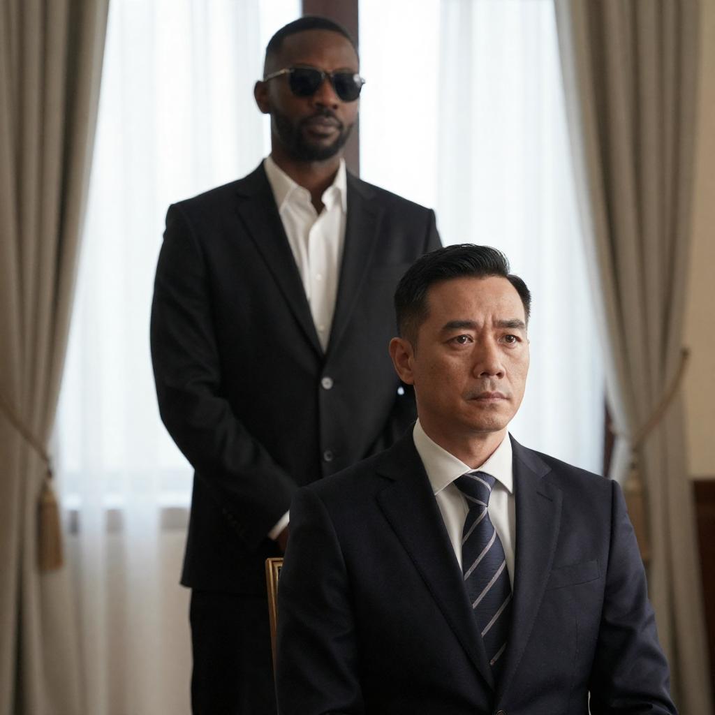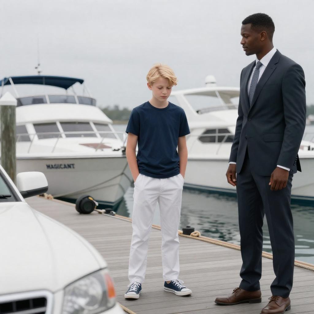 Photograph of two men at a dock. Blonde boy in navy T-shirt, white pants, and sneakers stands with hands in pockets, looking slightly down. Black man in suit and tie stands to the right. Two boats in the background, one labeled "MAGICANT." Foreground includes part of a white vehicle. Gray wooden dock with ropes and boating equipment. Overcast sky.