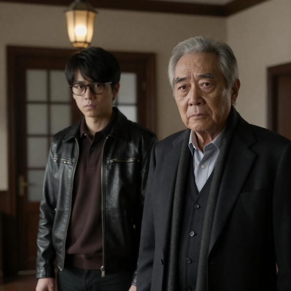 Photograph of two men playing pool in a dimly lit, wood-paneled room. The older man in a white shirt and black tie sits on the pool table, while the younger man in a black suit and red tie leans forward to line up a shot. Three green-shaded lamps hang above, illuminating the scene. Pool balls are scattered across the red table.