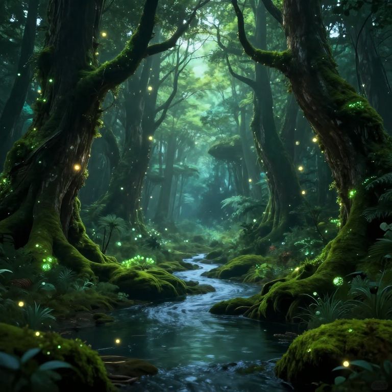 Stablediffusio mystical forest scene with ethereal floating lights, ancient trees covered in bioluminescent moss, a serene river flowing through, soft glowing atmosphere, fantasy art style with intricate textures and rich green hues.