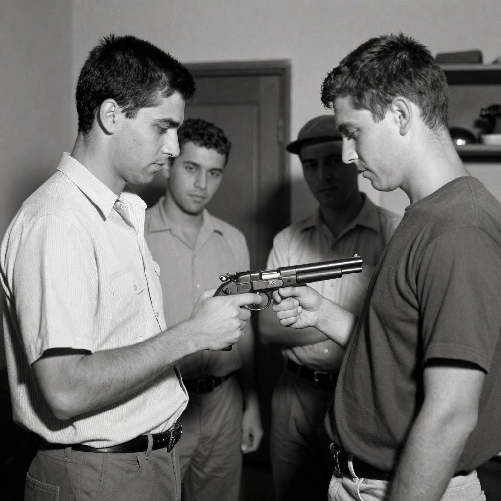 Gritty Black-and-White Men Examining Gun