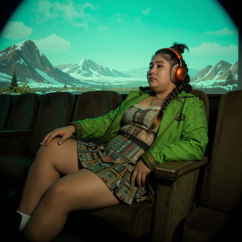 1girl, (stylized by Barclay Shaw:1.2), dark VRay, surreal, modelshoot style shot of a Serial Art Deserted overweight [Singaporean|Preppy] Chancellor (Wife and Husband:1.3), they are and Dana Davis, they are feeling very relaxed, behance, dressed in a very [Haunted|Fresh] Short skirt and a long jacket, their hair is Majestic and styled as French braid, they have a [Relaxing|Glittering] Aborigine deep orange Headphones, Empty Eyes, from inside of a Awful Movie theater, summer roots and mountains, Snowy, FOV 90 degrees, Light, Computer Art, side lit, Fish-eye Lens, Autochrome, Teal sky, Lime green palette, realistic and detailed, natural skin tones, lots of details, 8K, sparkling, moody