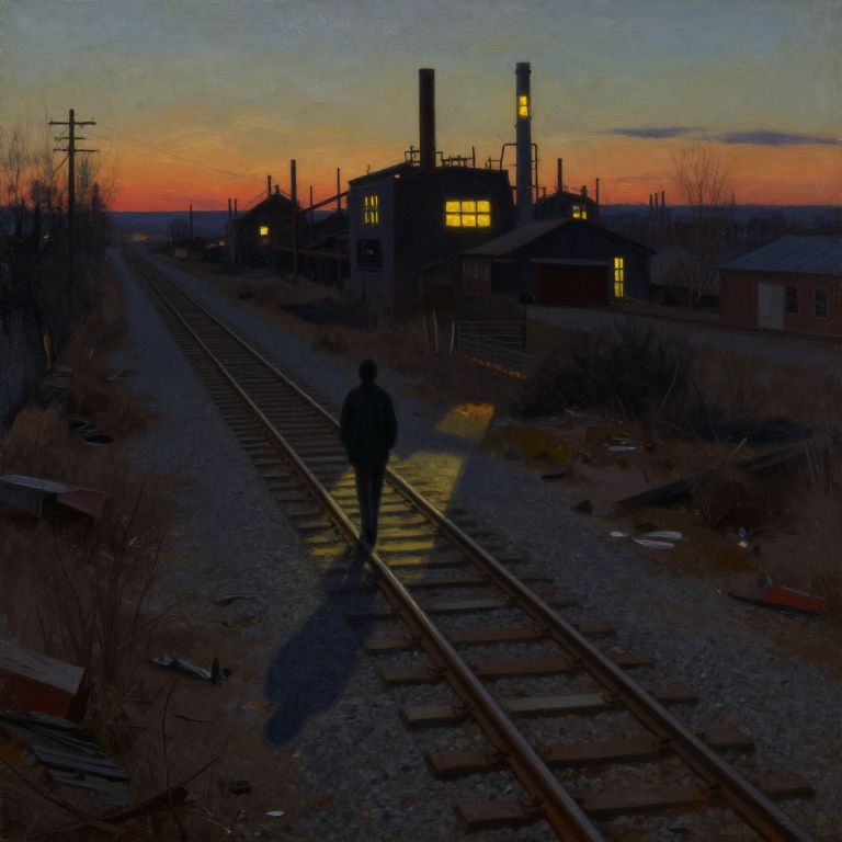 A mesmerizing oil painting captures the essence of a desolate industrial landscape at twilight, reminiscent of Hopper's iconic works. From an elevated perspective, the viewer observes a solitary figure strolling along an abandoned railway track, their elongated shadow stretching across rusty rails and weathered sleepers. In the background, distant factories emit an eerie glow, their windows reflecting the warm hues of the setting sun and casting flickering shadows on the ground. This haunting scene evokes a profound sense of loneliness and curiosity, drawing viewers into the enigmatic story behind this lone wanderer's journey through the forsaken remnants of industry.