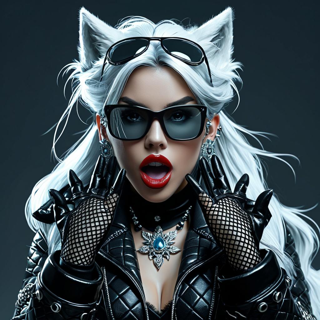 Digital art of a pale-skinned, white-haired woman with cat ears, black leather jacket, sunglasses, and finger to lips, wearing dark sunglasses and