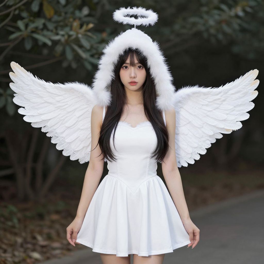 Photograph of an East Asian woman with long, straight black hair, wearing a white, sleeveless, knee-length dress and large, fluffy white angel wings. She has a white, furry halo on her head and is standing outdoors on a path with dark green foliage in the background. Her expression is neutral, and she looks directly at the camera. The image has a slightly soft focus, giving it a dreamy, ethereal quality. The contrast between her white angelic attire and the dark background emphasizes her as the central figure.