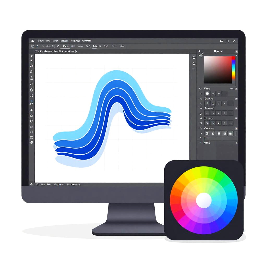 Vector art maker theme illustrating a vibrant desktop environment displaying a complex vector design in progress, with layers, grids, and curves visible, accompanied by a dynamic color wheel and editing keys, rendered in smooth, sharp, and minimalist style.