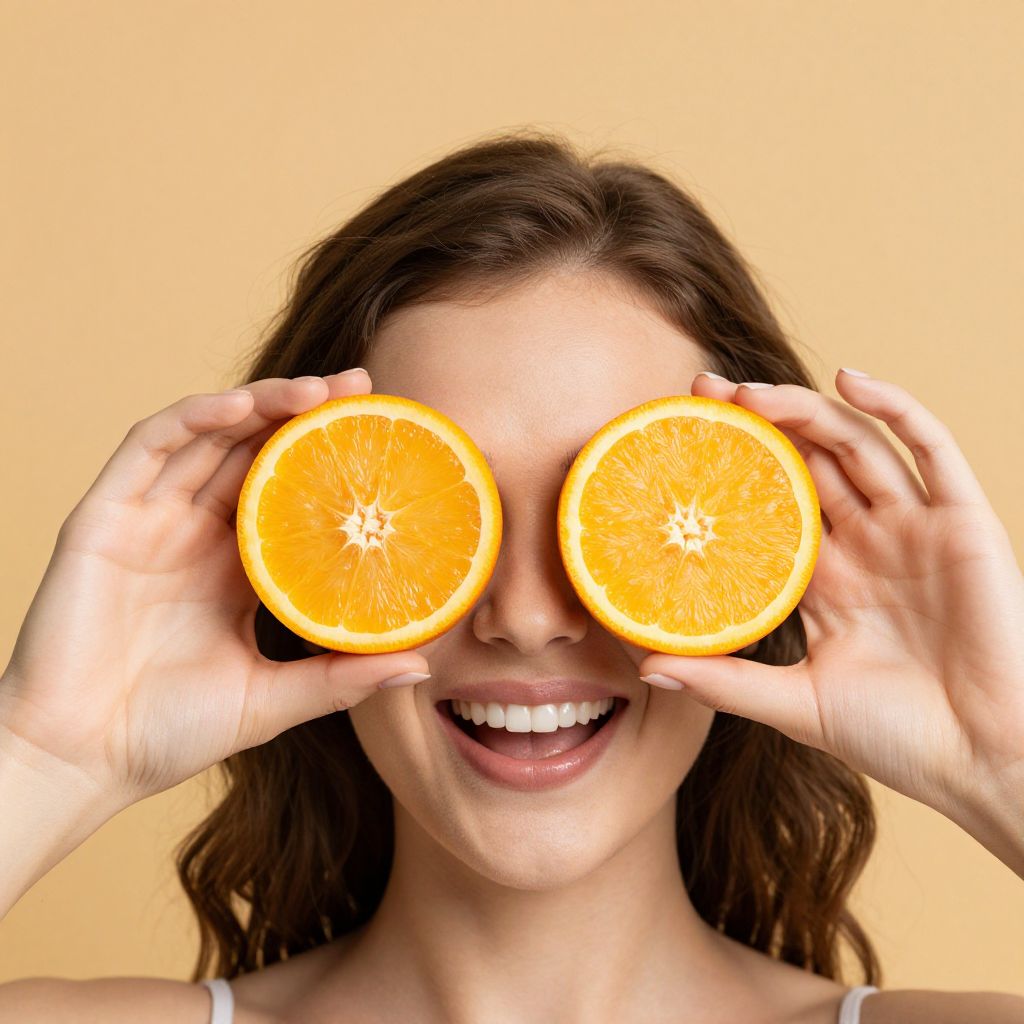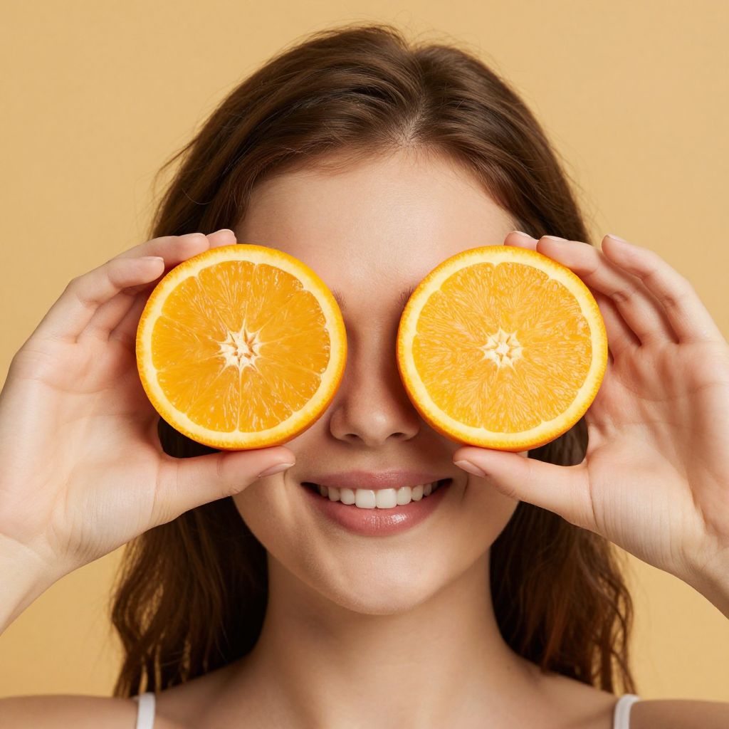 Woman playfully holding two vibrant orange halves over her eyes against a warm yellow background, symbolizing the benefits of vitamin C for eye health.
