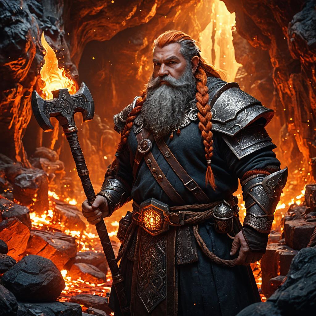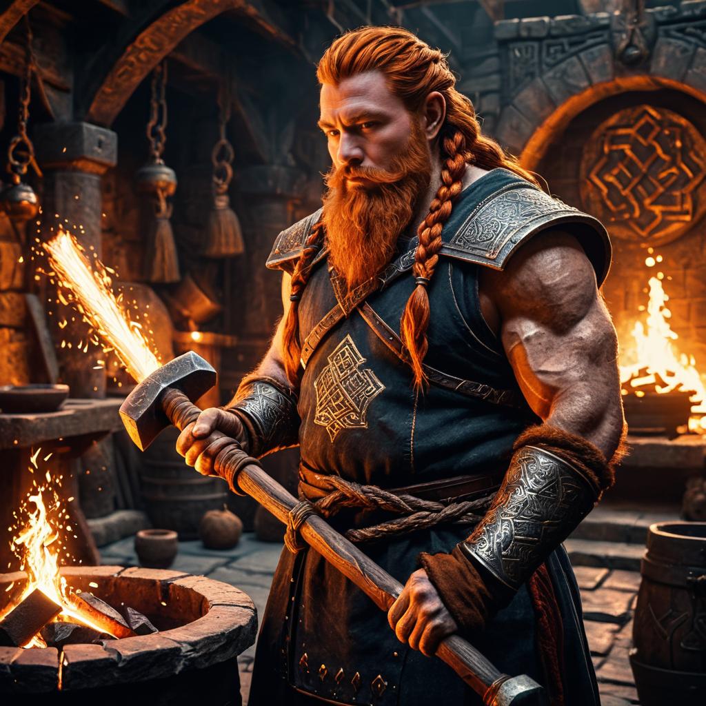 Portrait of a muscular male dwarven blacksmith with long braided red hair and beard, wearing detailed metal armor and leather attire. He is holding a large hammer crackling with fiery runes, standing in an ancient forge filled with glowing molten metal and fire. The scene features intricate medieval decor and cinematic golden hour lighting, showcasing a highly detailed fantasy setting.