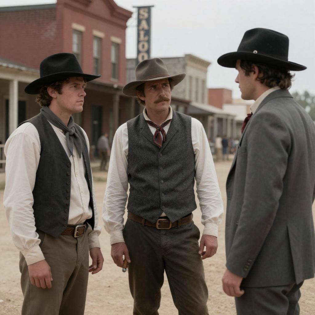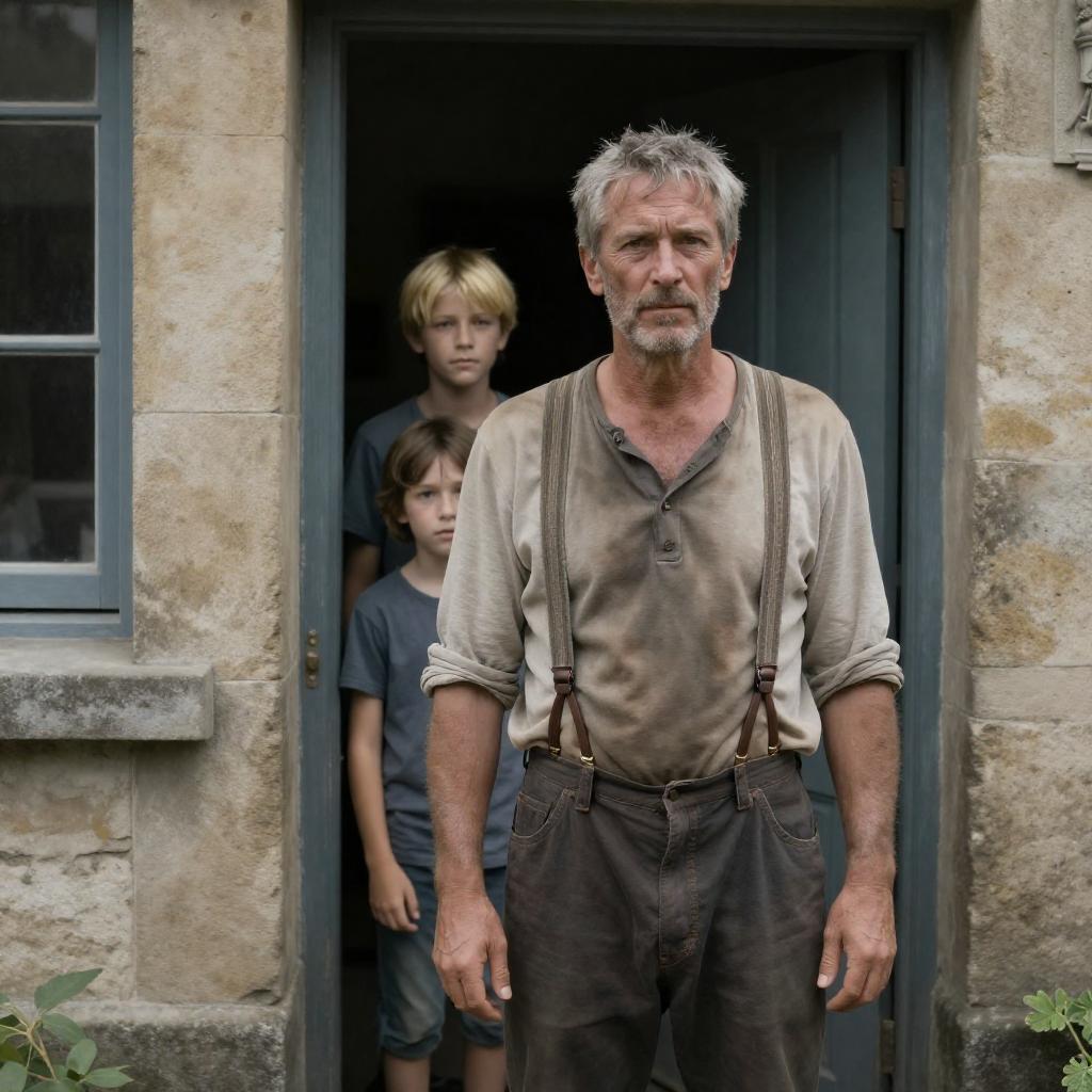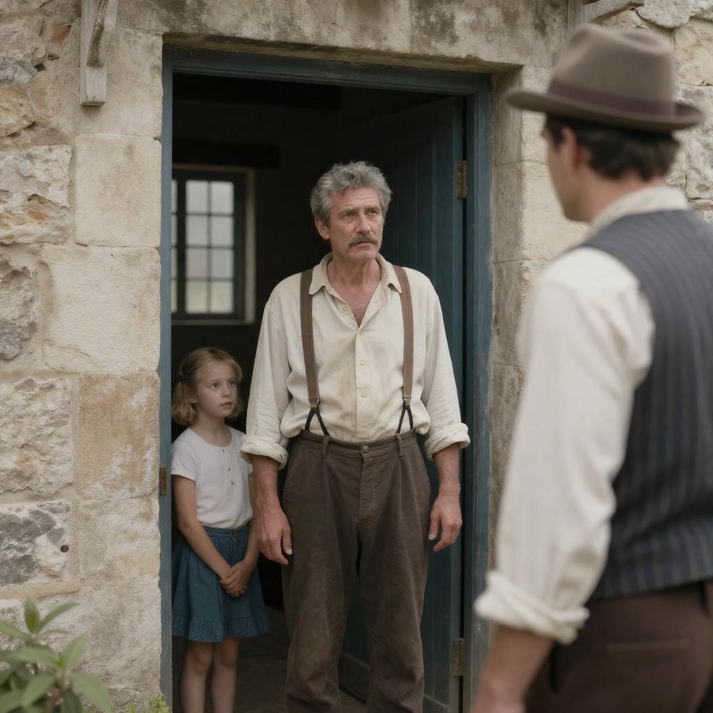 Photograph of an old stone building. A middle-aged man with gray hair and a mustache, wearing a dirty white shirt and brown suspenders, stands in the doorway. A man with a hat and striped vest faces him. Two children, a blonde girl and a young boy, stand in the background. The man's expression is serious. The children look curious. The door and window are visible.