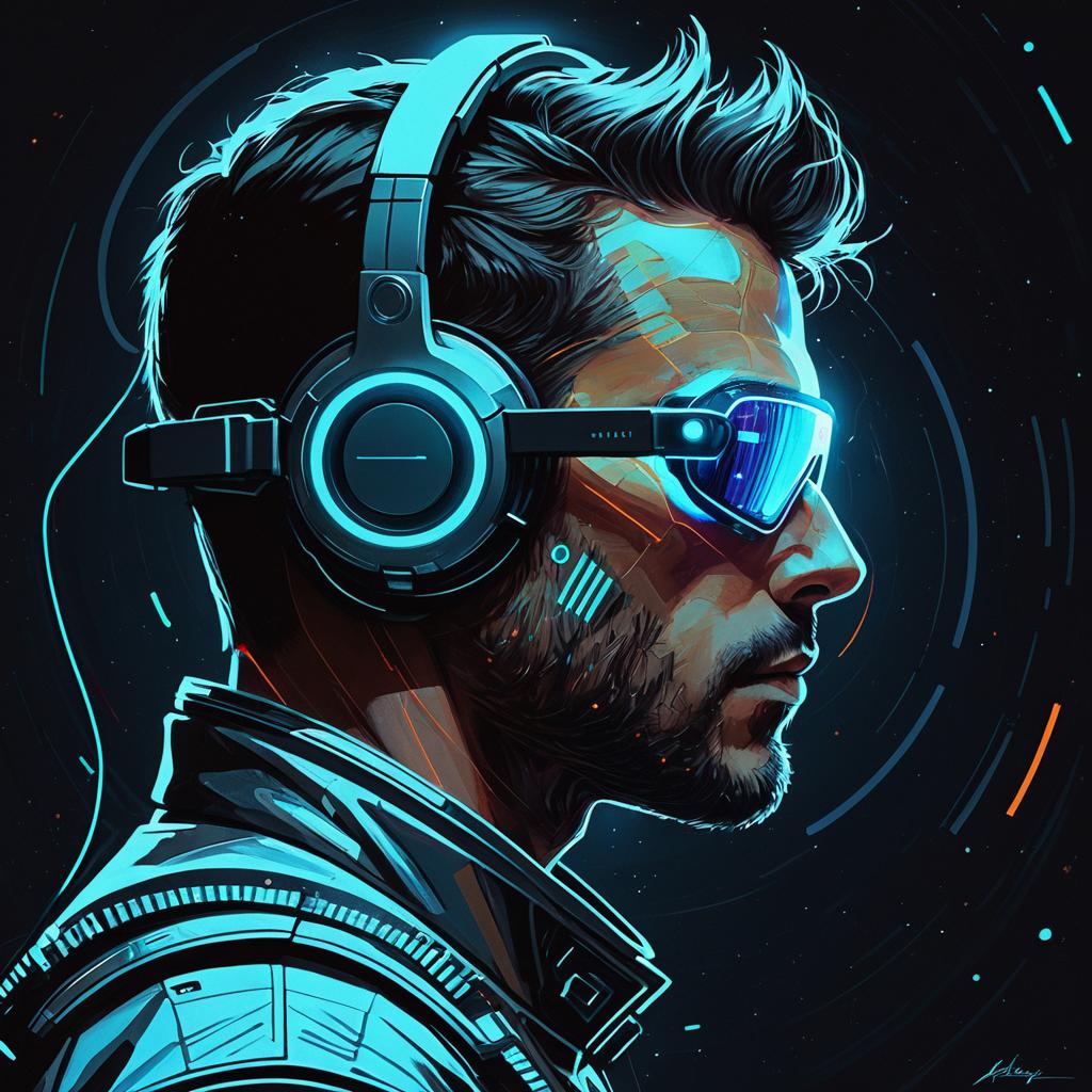 Digital painting of a futuristic man in a cyberpunk style, featuring a side profile shot. He wears a glowing headset and sleek cyclops display glasses with neon blue accents. The artwork highlights holographic colors and electric light effects, blending a high-tech aesthetic with a detailed, desaturated portrait style.
