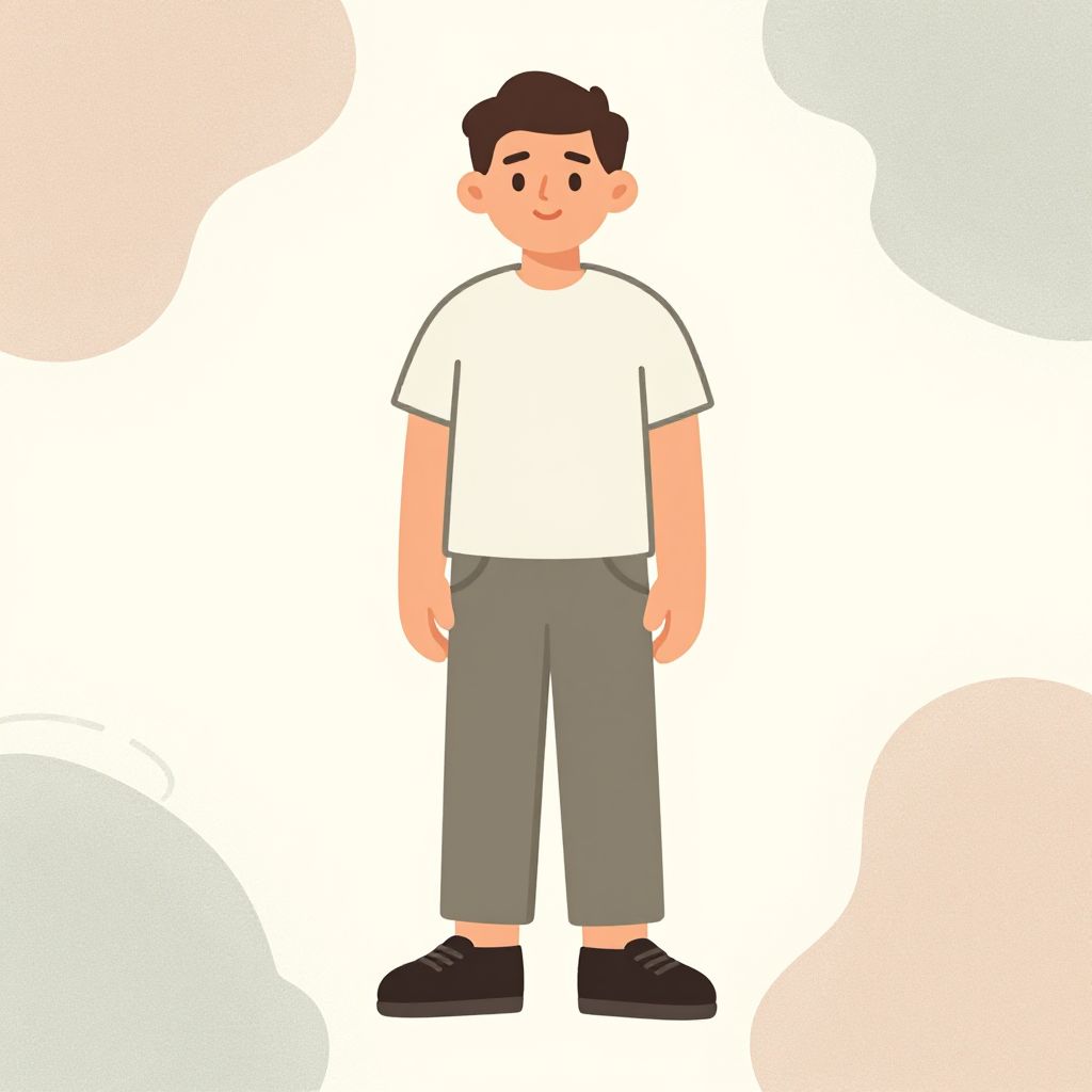 Digital cartoon illustration of a young boy with short dark brown hair, fair skin, and a small, smiling mouth. He wears a plain white short-sleeve T-shirt, gray pants with his hands in his pockets, and black sneakers. The background features soft, pastel-colored abstract shapes in peach, pale green, and white, creating a gentle, playful atmosphere. The boy stands centered, facing forward, with a simple, clean design style.