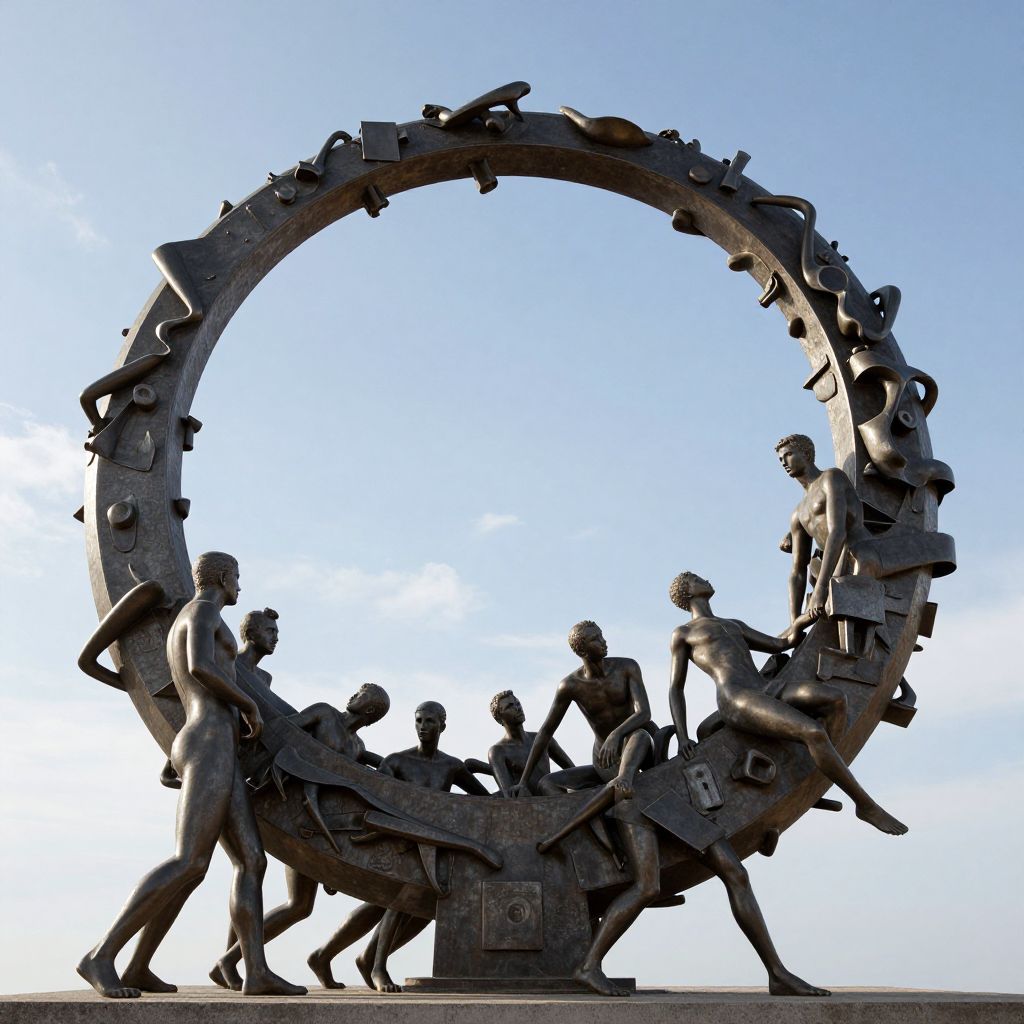 Photograph of a large, circular bronze sculpture featuring a group of human figures in dynamic, running poses. The figures, mostly nude with varied muscular builds, are intricately detailed and positioned around the circle. The sculpture's design incorporates a mix of abstract and figurative elements, with some figures holding or interacting with parts of the circular structure. The background is a clear, bright blue sky, providing a stark contrast to the dark bronze of the sculpture. The overall style is modern and dynamic, with a sense of movement and energy.