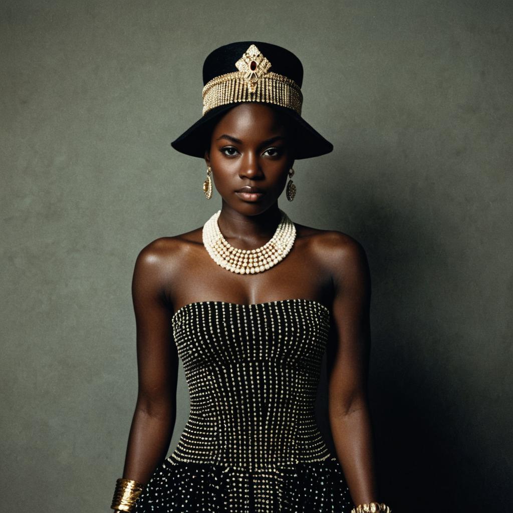 Portrait of a dark-skinned African woman wearing traditional strapless clothing with geometric black and white patterns. She has intricately braided hair adorned with colorful beads, accessorized with a white beaded necklace and large decorative earrings. The woman smiles confidently against a textured beige background, showcasing her bare shoulders and elegant style.