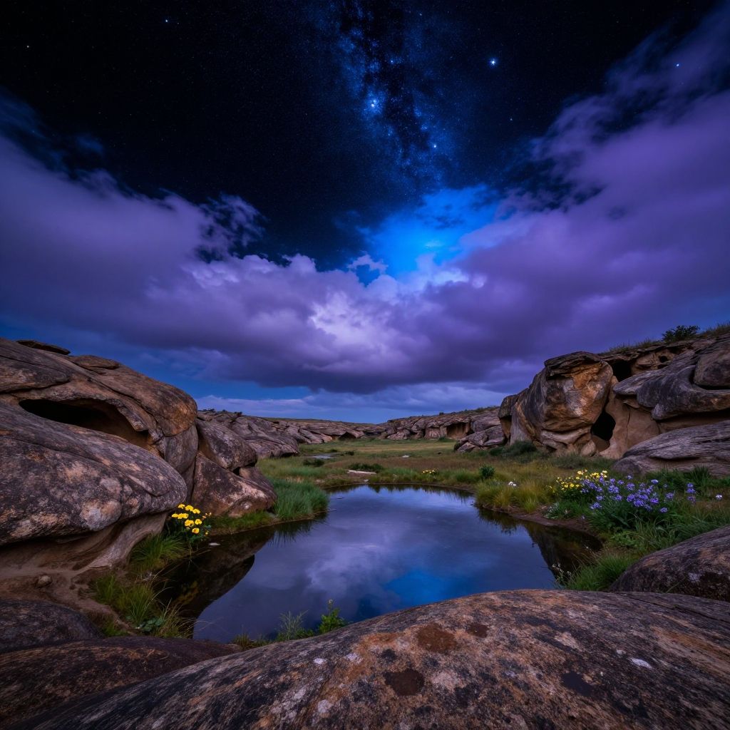 Photograph of a serene, nighttime landscape featuring a small, reflective pond surrounded by large, rugged rocks. The sky is a vibrant blend of deep blues and purples, with starry constellations and a Milky Way-like phenomenon. Fluffy clouds partially cover the sky. Green grass and yellow wildflowers are visible around the pond's edge, adding color contrast. The rocks have a rough, textured surface. The reflective water mirrors the sky and clouds above, creating a symmetrical effect. The scene is calm and picturesque, evoking a sense of tranquility and natural beauty.