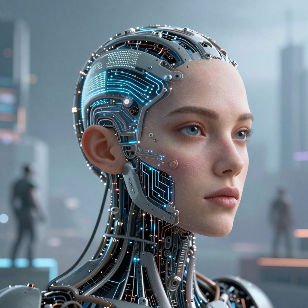 CGI image of a young woman with a cybernetic head, featuring intricate blue and silver circuitry, in a futuristic lab.