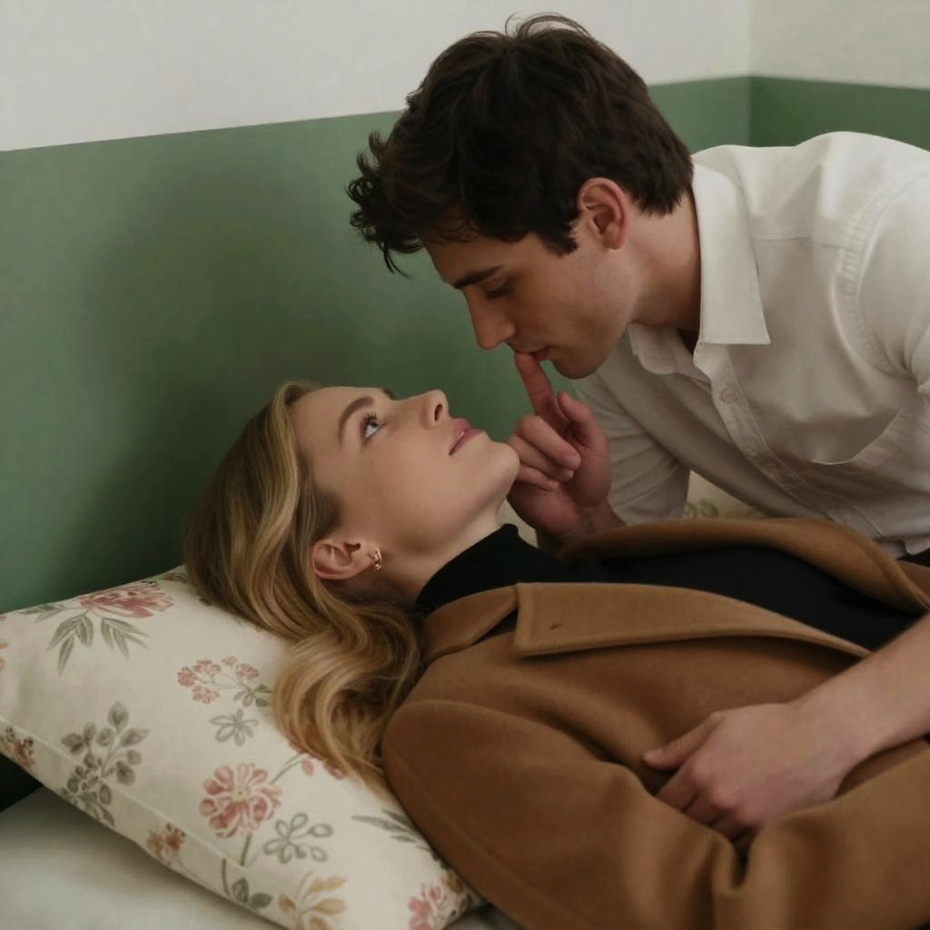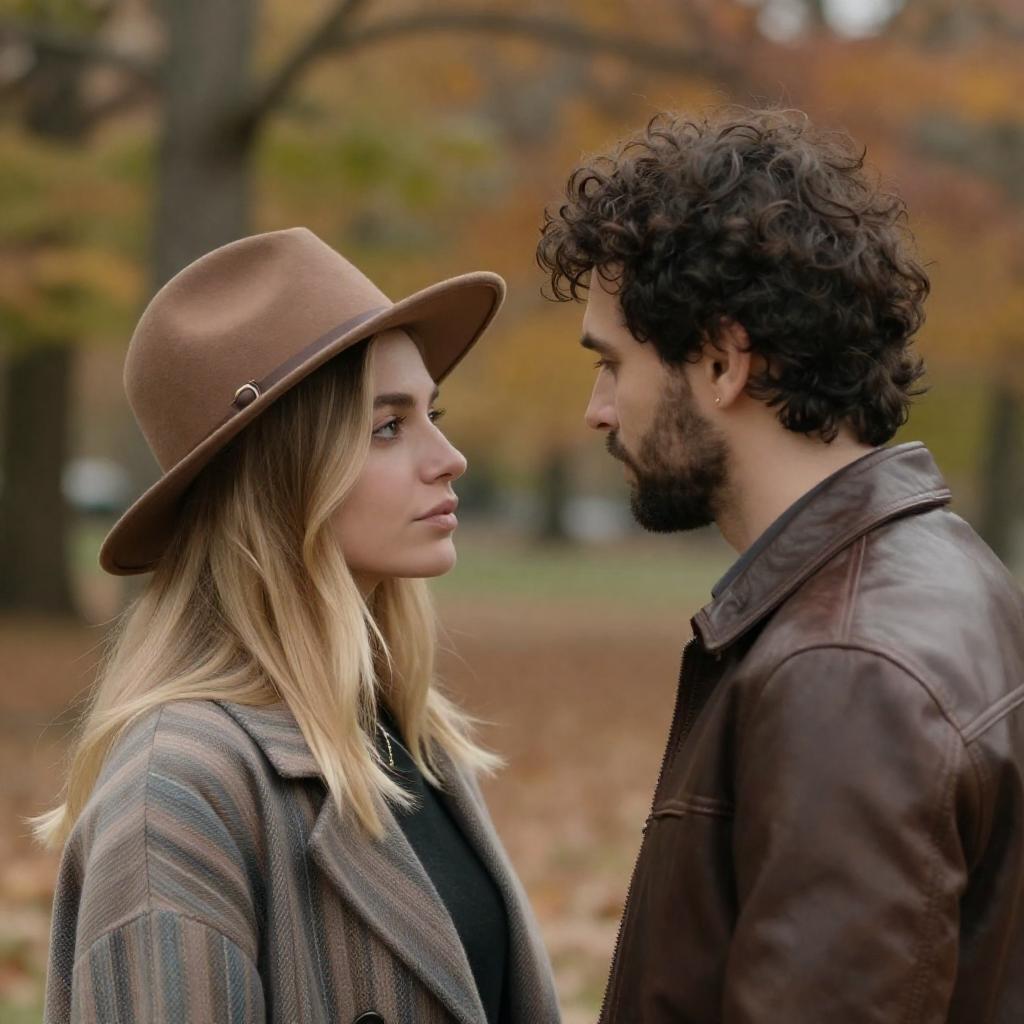Photograph of a man and woman facing each other in profile. Man has brown beard, dark sunglasses, white and pink striped headband, beige coat, gray scarf. Woman has straight blonde bob, brown fur collar, slight smile. Concrete wall background.