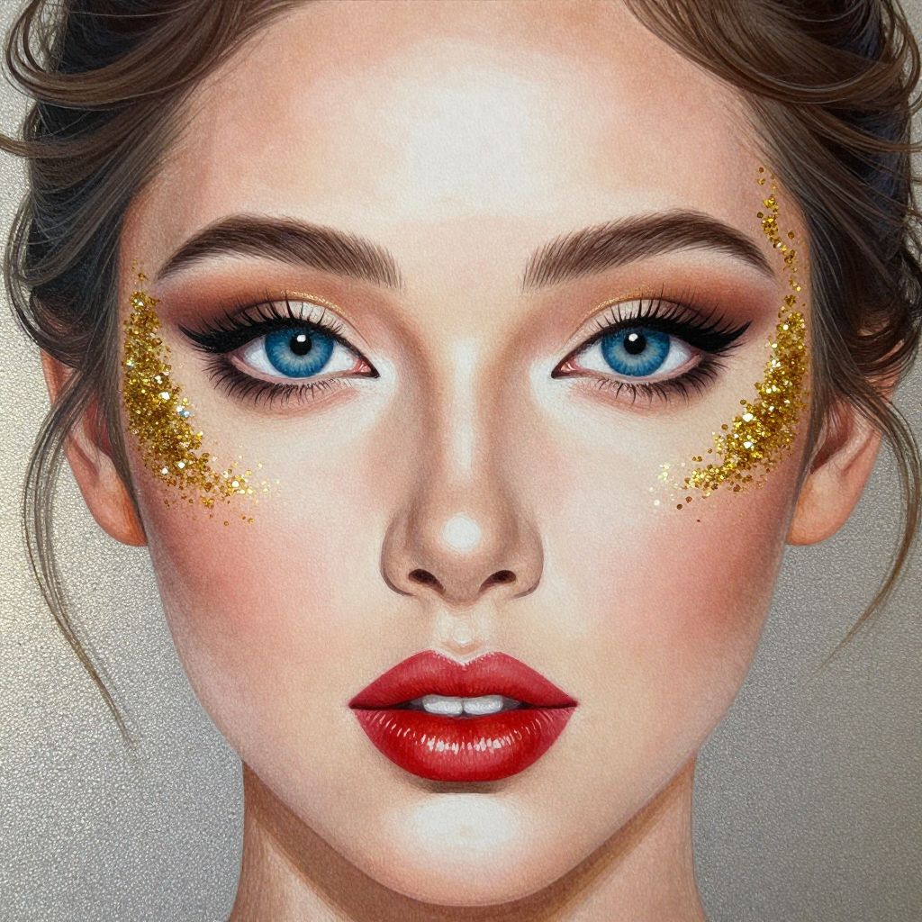 Photorealistic digital portrait of a fair-skinned woman with striking blue eyes and full red lips. She has blonde hair styled in a neat updo. Gold glitter is applied in a diagonal pattern on her right cheek and forehead. Her makeup includes dark, dramatic eyeliner and subtle eyeshadow. The background is a textured, shimmering silver. The image focuses on her face, showcasing her flawless skin and vibrant makeup. The style is hyper-realistic with a focus on glamour and beauty.
