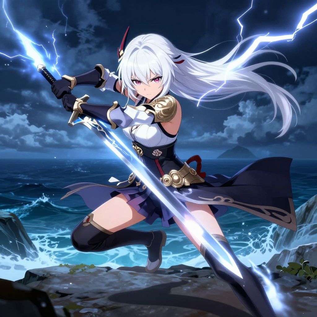 Dynamic action scene featuring a long white hair anime girl wielding a glowing sword, mid-battle pose on a cliff overlooking a stormy sea, dramatic lighting with lightning strikes, intense expression, intricate armor with ornate designs, anime style with vivid colors