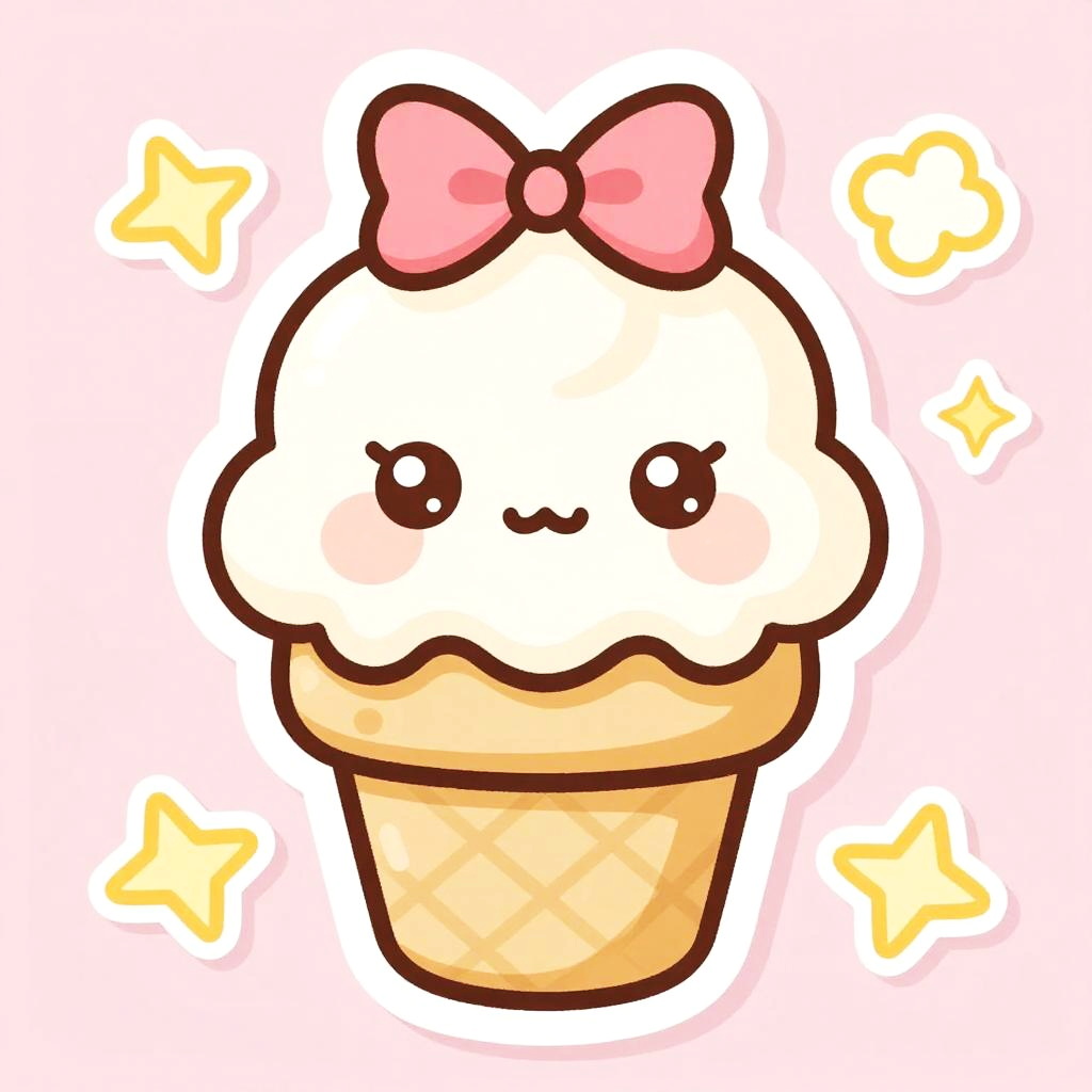 Kawaii sticker drawing illustrating an anthropomorphic ice cream cone with a cute face, melting slightly with drips, big round eyes and a bow, vibrant colors with soft shadows and a glossy sticker texture