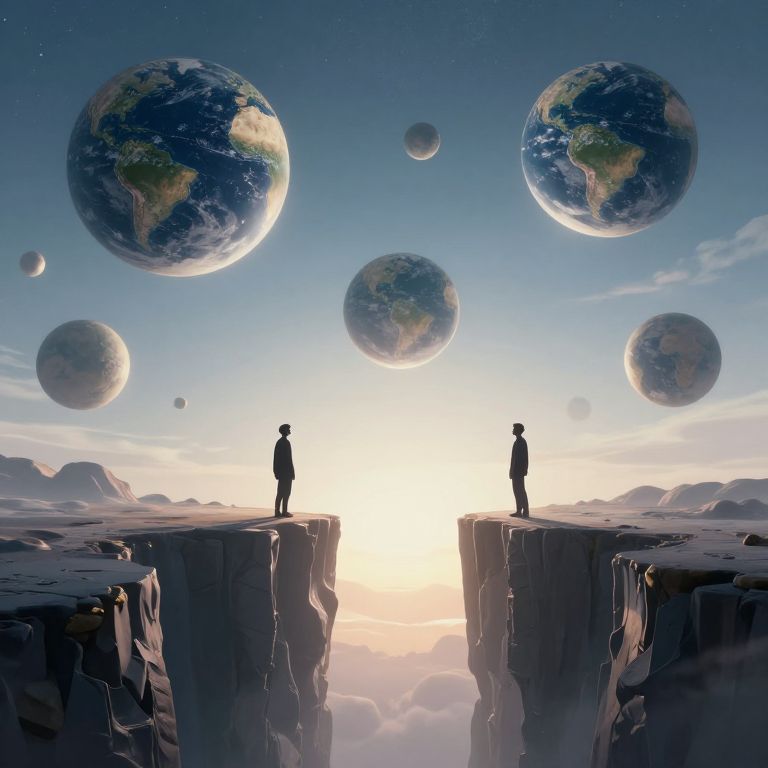 In a surreal dreamscape where floating spheres cradle worlds within worlds, figures stand at the edge of a luminous chasm, their silhouettes bathed in ethereal light, embodying the quiet awe of witnessing the infinite dance between creation and transience.