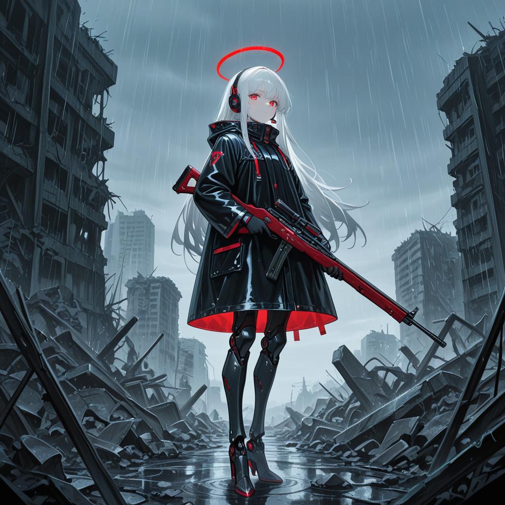 Masterpiece, best quality, 1girl, red eyes, white hair, mechanical legs, raincoat, black gloves, black coat, raining, sky, ruins, rifle, headset, rubble, android, long hair, halo