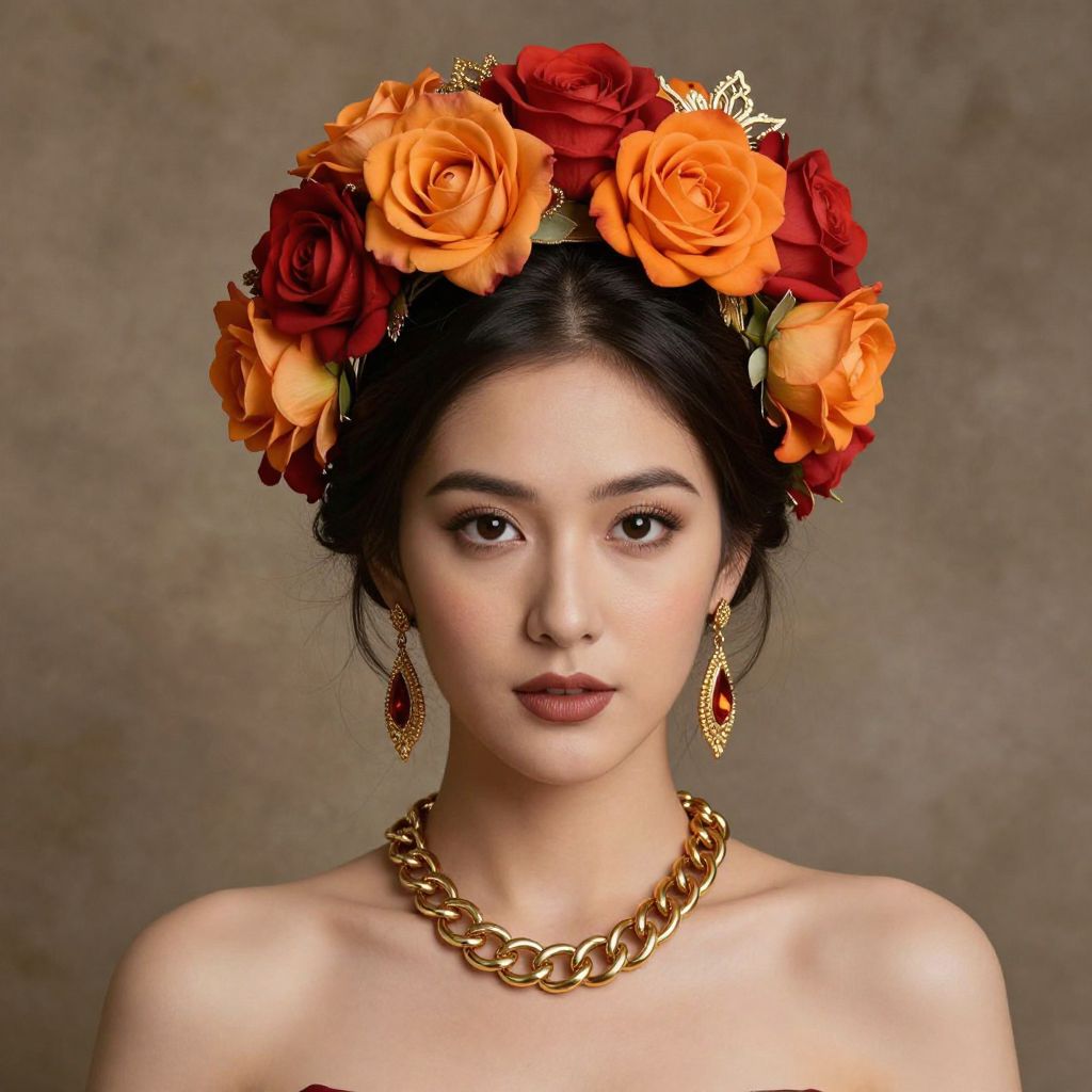 Elegant portrait featuring a woman adorned with a floral headpiece, showcasing vibrant orange and red roses intertwined with intricate gold detailing, complemented by dangling earrings and a bold chain necklace, set against a textured background with soft earthy tones.