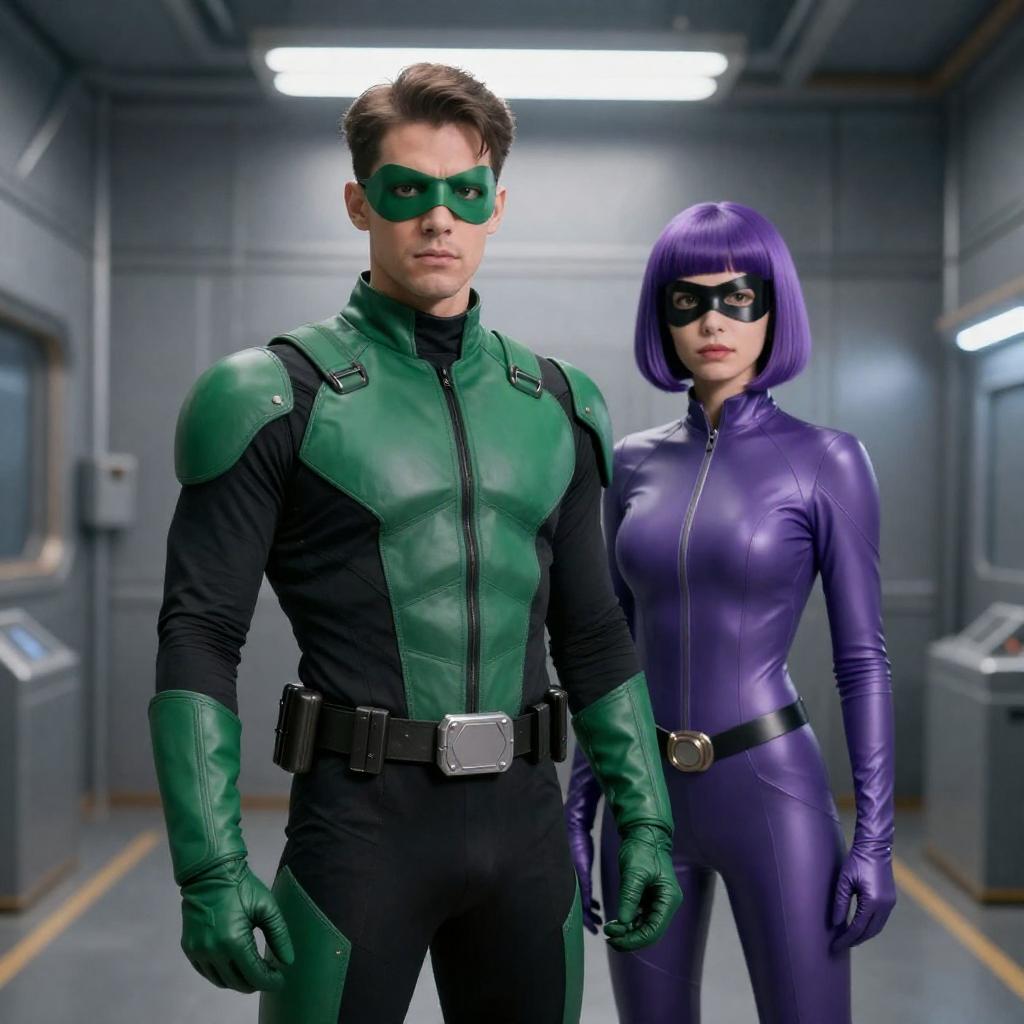 Portrait of two superheroes standing in a metallic, industrial room. The man is wearing a green and black armored suit with matching gloves and mask. The woman has a sleek purple bob haircut and wears a shiny purple bodysuit with a black mask and belt. Both have intense expressions and are illuminated by bright overhead lights.
